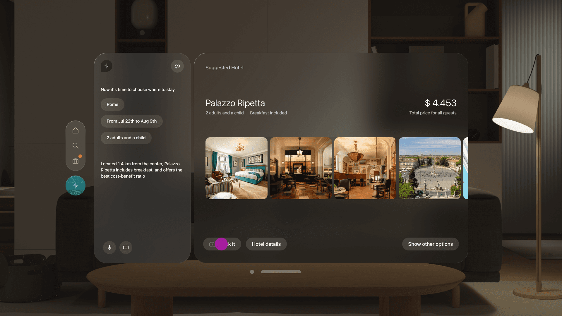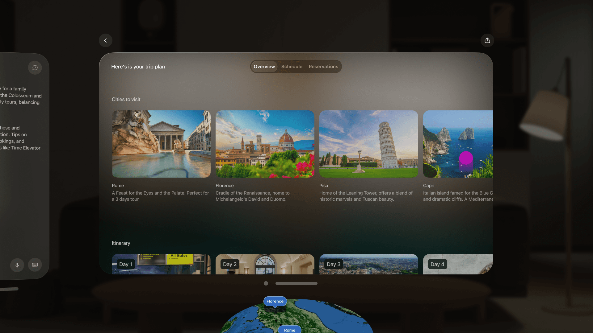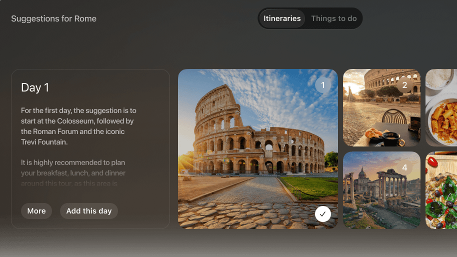 To integrate the immersive experience of Vision Pro with the capabilities of generative AI, we proposed a product experience in which users can rely on a digital concierge to help plan their next trip. By leveraging the device’s immersive capabilities, the experience supports users in making decisions, building itineraries, and addressing every aspect of their journey in a seamless and engaging way.
