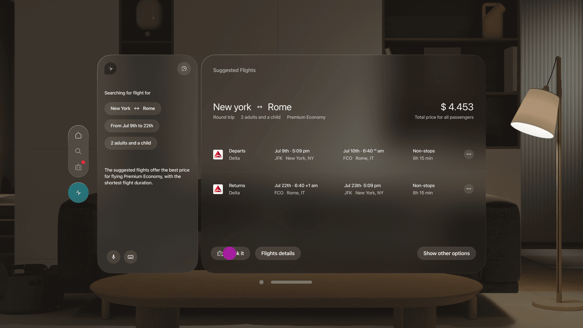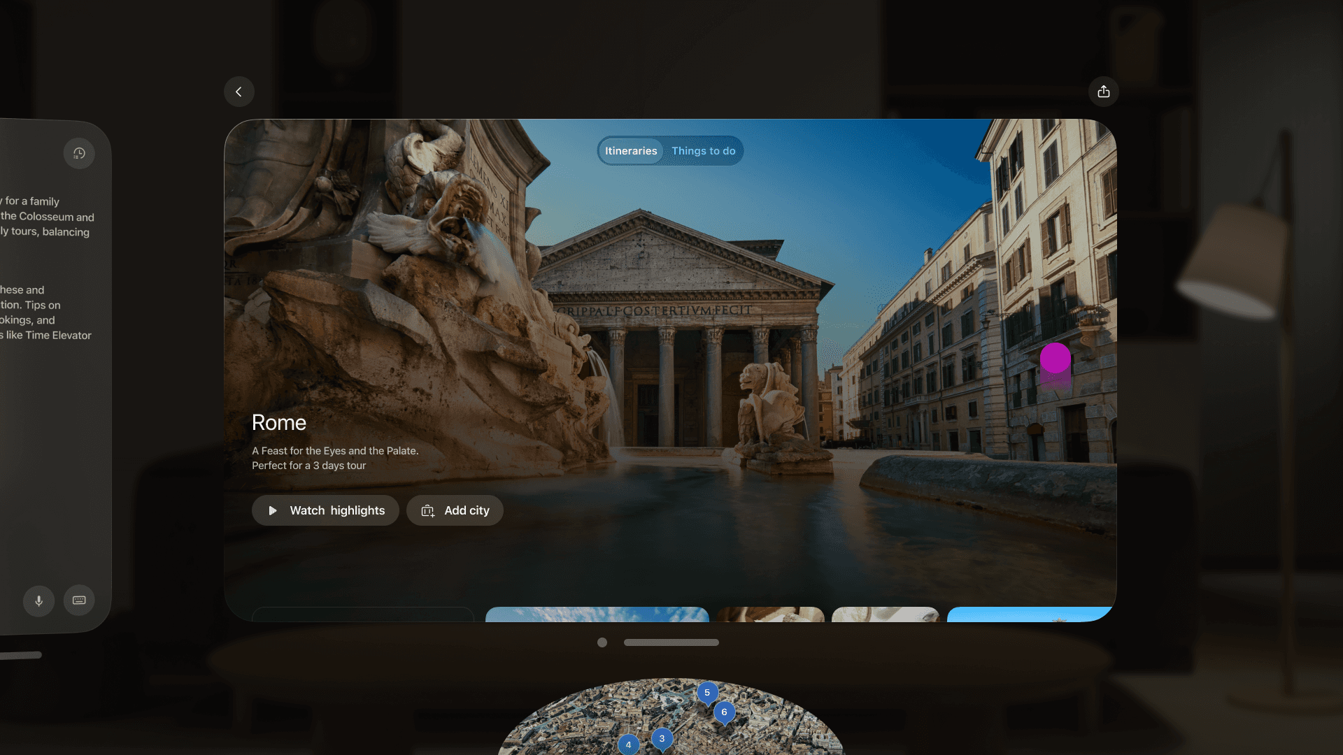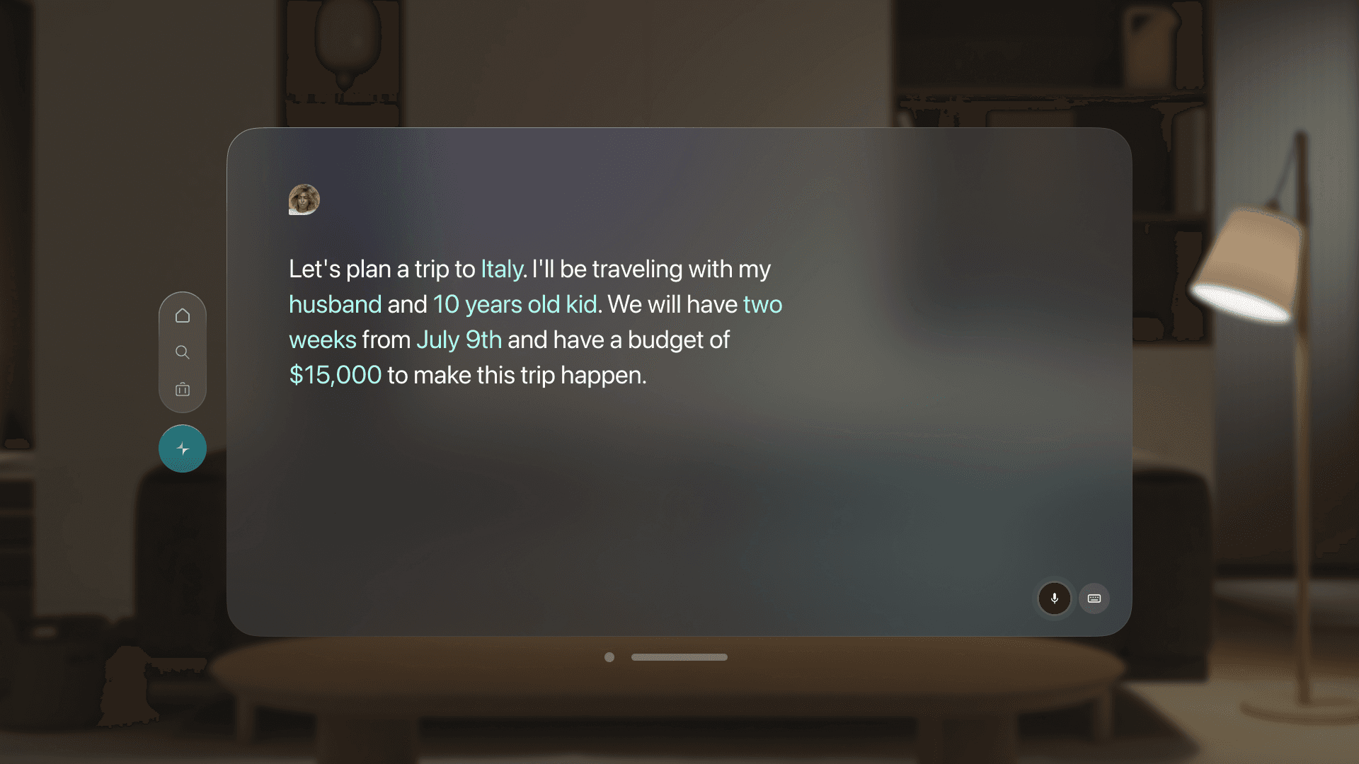 To integrate the immersive experience of Vision Pro with the capabilities of generative AI, we proposed a product experience in which users can rely on a digital concierge to help plan their next trip. By leveraging the device’s immersive capabilities, the experience supports users in making decisions, building itineraries, and addressing every aspect of their journey in a seamless and engaging way.